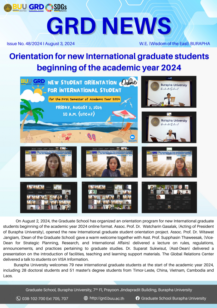 On August 2, 2024, the Graduate School has organized an orientation program for new International graduate students beginning of the academic year 2024 online format. Assoc. Prof. Dr. Watcharin Gasalak, (Acting of President of Burapha University), opened the new International graduate student orientation project. Assoc. Prof. Dr. Witawat Jangiam, (Dean of the Graduate School) gave a warm welcome together with Asst. Prof. Supphasin Thaweesak, (Vice-Dean for Strategic Planning, Research, and International Affairs) delivered a lecture on rules, regulations, announcements, and practices pertaining to graduate studies. Dr. Suparat Sukwisut, (Asst-Dean) delivered a presentation on the introduction of facilities, teaching and learning support materials. The Global Relations Center delivered a talk to students on VISA Information.