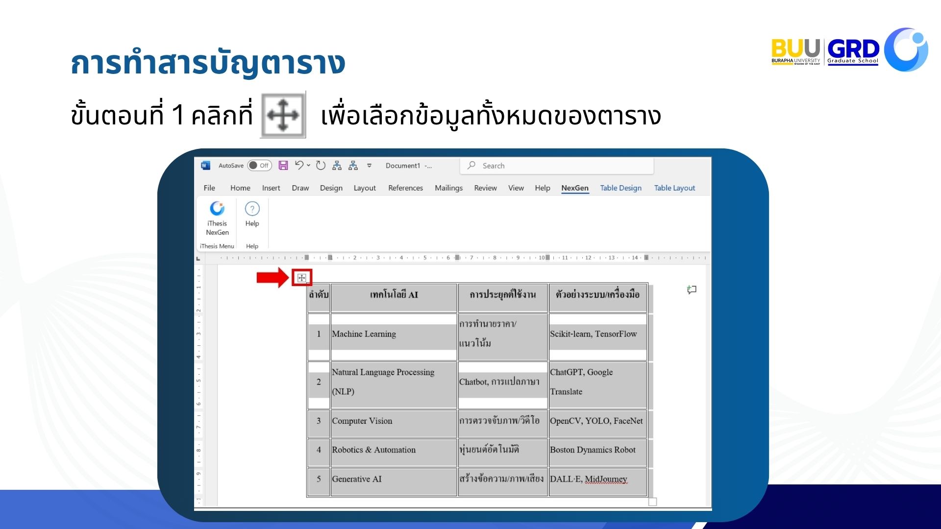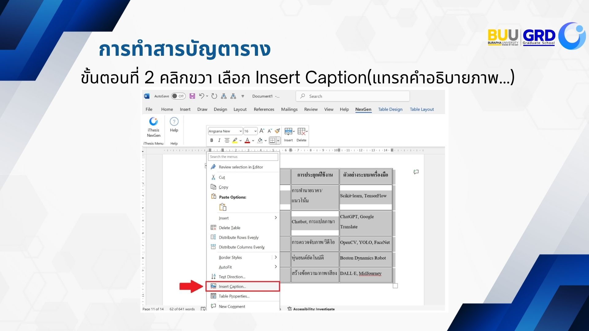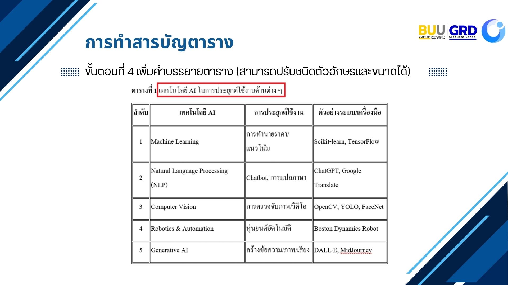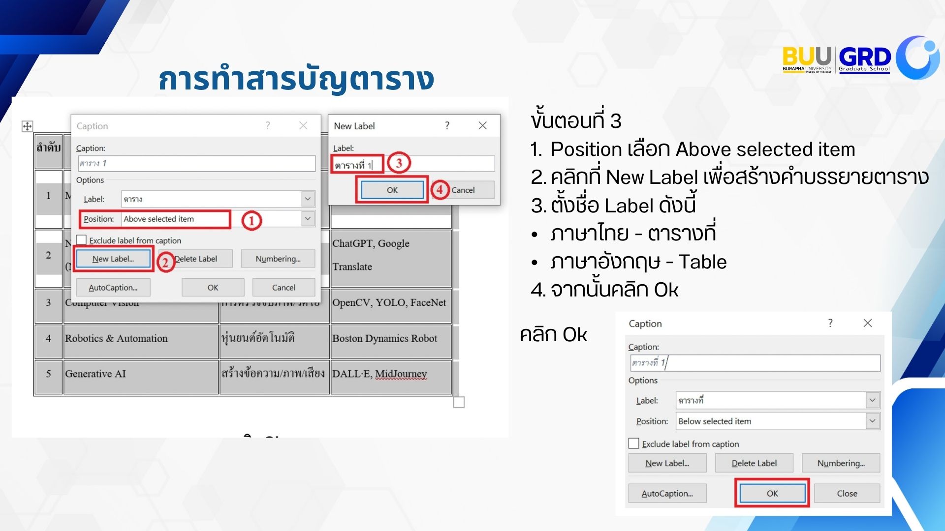 การใส่คำอธิบายและการสร้างหน้าสารบัญตาราง