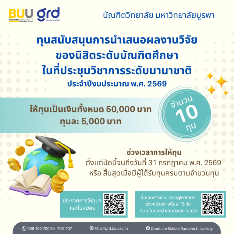 ทุนสนับสนุนการนำเสนอผลงานวิจัยของนิสิตระดับบัณฑิตศึกษาในที่ประชุมวิชาการระดับนานาชาติ ประจำปีงบประมาณ พ.ศ. 2569